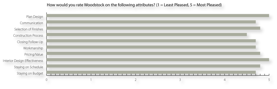 “We contracted with Woodstock to build our new home. This was our fourth new home. The experience with Woodstock was exceptionable. We visited several of their projects and were impressed with the quality of craftsmanship and design style. We rated their homes superior to the competition and an excellent value. We made the buy decision from a set of drawings which were complete and comprehensible. The negotiation process with Bob Slawson was easy to understand and comfortable. We were able to visit the property during construction and meet with Nick Winnings during the process. Nick was diligent and cooperative. All of our requested changes were handled quickly and more than fairly. We needed to make a lot of choices and decisions based on the promised closing date; we were pleasantly surprised that they came within only one day of meeting the original promise date. We are very happy in our new home and would certainly choose Woodstock again.”