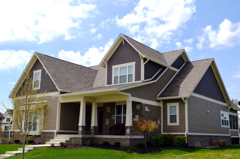 It is a craftsman style exterior with brick wrapped around the foundation and brick and stone accents on the front elevation.